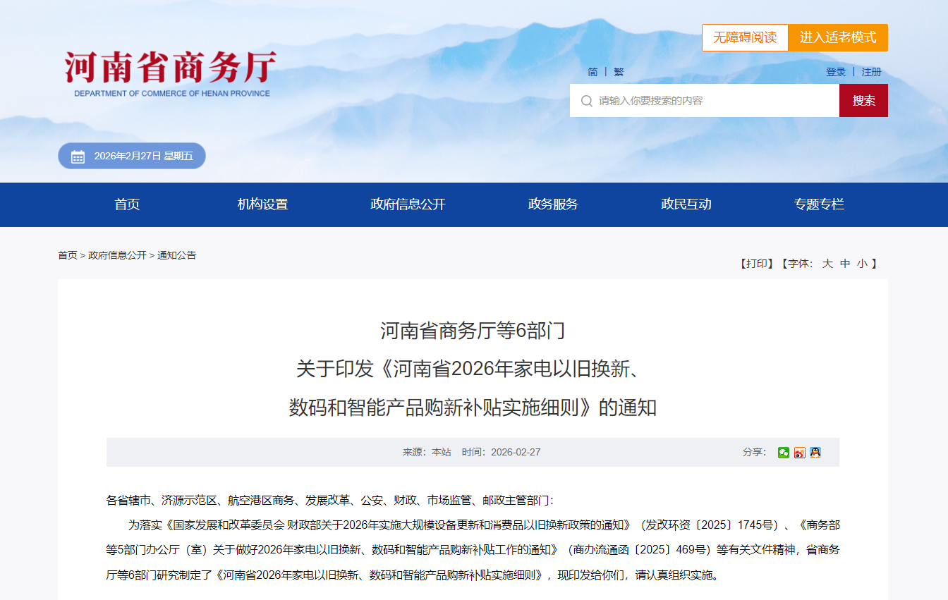 大河网讯 想换家电,买手机的小伙伴们看过来!近日,省商务厅等6部门印发《河南省2026年家电以旧换新、数码和智能产品购新补贴实施细则》(以下简称《实施细则》),自2026年1月1日起至补贴资金用完为止,消费者购买指定品类家电与数码和智能产品,可享受15%的政府补贴。